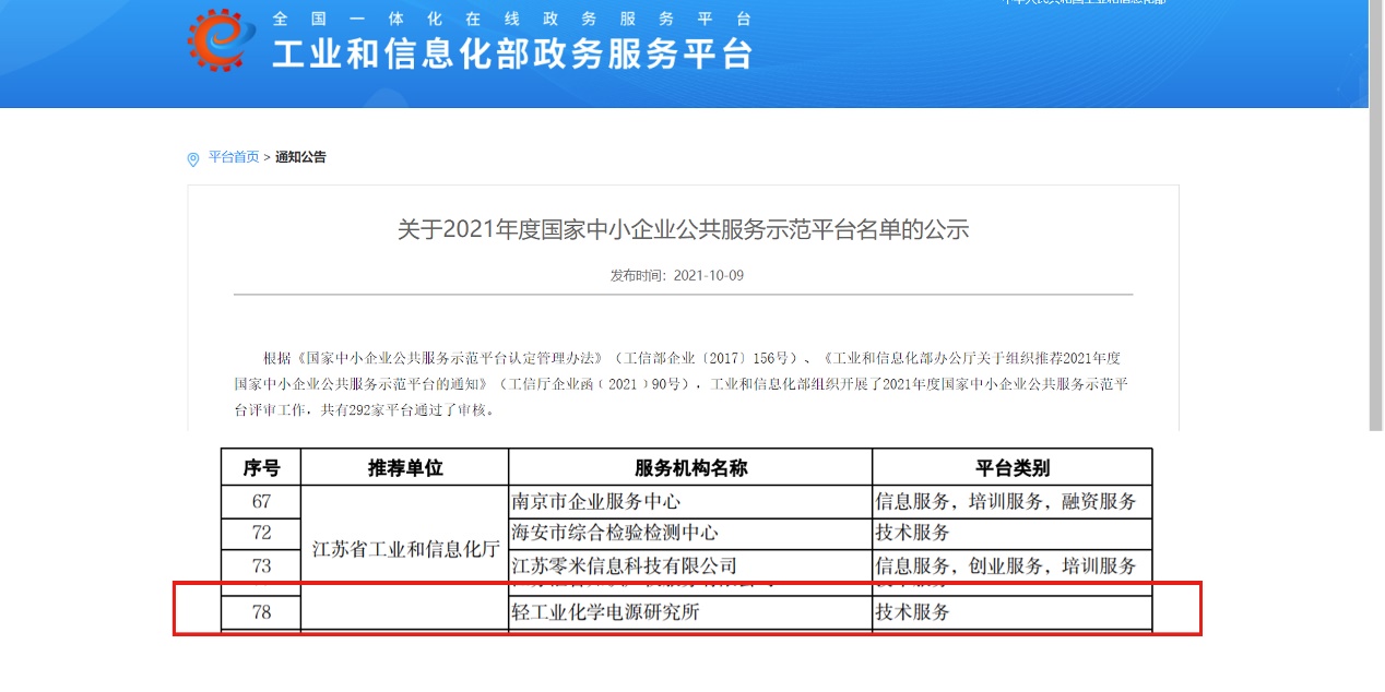 近日,工业和信息化部发布了2021年度国家中小企业公共服务示范平台名单,我所被授予“国家中小企业公共服务示范平台”称号。我所依托苏州大学能源学院在人才、科技、信息等方面的优势,紧密结合江苏省及长三角地区新能源产业特色,全方位、深层次做好技术及信息服务;进一步培育新兴电池产业、提高企业自主创新能力;促进行业内相关信息和资源的共享,减少项目的盲目建设和产品研发的低水平重复,减少企业不必要的损失;推进电池产业朝着规模化、集群化方向发展,为中小企业提供一个化学电源行业公共的信息交流平台、技术支撑服务平台、人才培养平台。2020年,我所实现服务企业261家;组织开展技术培训服务11次,累计参与人数达500人次;组织参与制修订标准5项,申报国家标准、行业标准各1项,获批颁布国家标准4项、行业标准1项;获得江苏省自然自然科学基金1项。