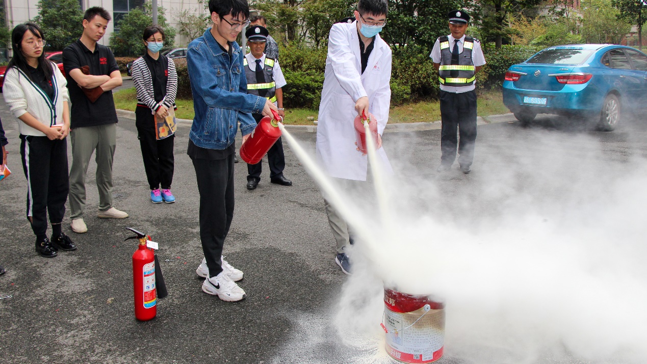 随后进行了危化品泄漏处置应急演练和化电所办公实验大楼全楼疏散演习及现场消防演练工作。实验员钱君杰和叶嘉琦模拟危化品倒置泄漏场景进行应急处置。安全员钱程进行了灭火器使用现场演示,大家积极参与,认真总结,演练活动达到预期目的。