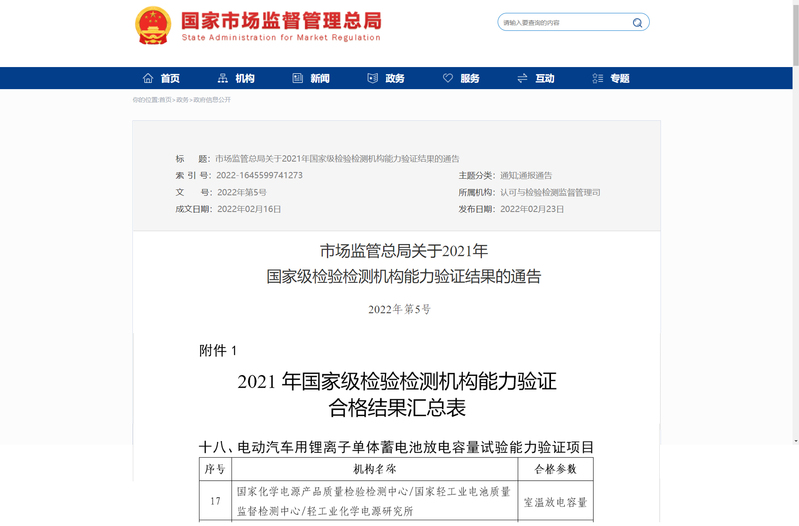 近日,市场监管总局通告了2021年国家级检验检测机构能力验证结果,我所国家化学电源产品质量检验检测中心/国家轻工业电池质量监督检测中心参加的电动汽车用锂离子单体蓄电池放电容量试验能力验证获得“合格”结果。