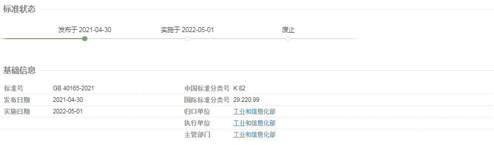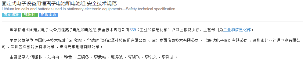 2021年4月30日,国标标准化管理委员会印发了2021年第6号中国国家标准公告,强制性国家标准GB 40165-2021《固定式电子设备用锂离子电池和电池组 安全技术规范》由国家市场监督管理总局、国家标准化管理委员会批准发布,该标准将于2022年5月1日起开始实施。该标准由工信部锂离子电池安全标准特别工作组负责组织起草,中国电子技术标准化研究院为第一起草单位。